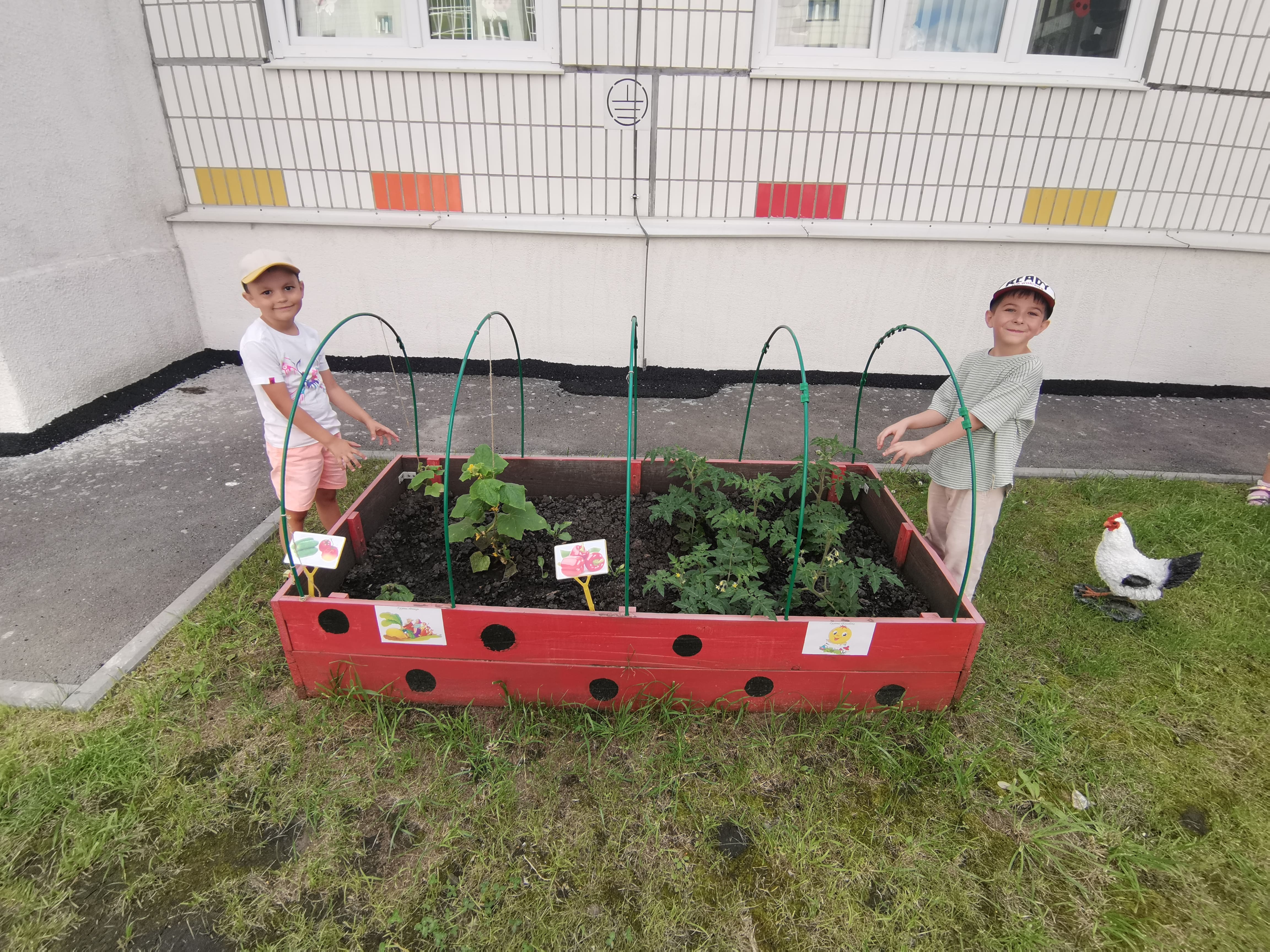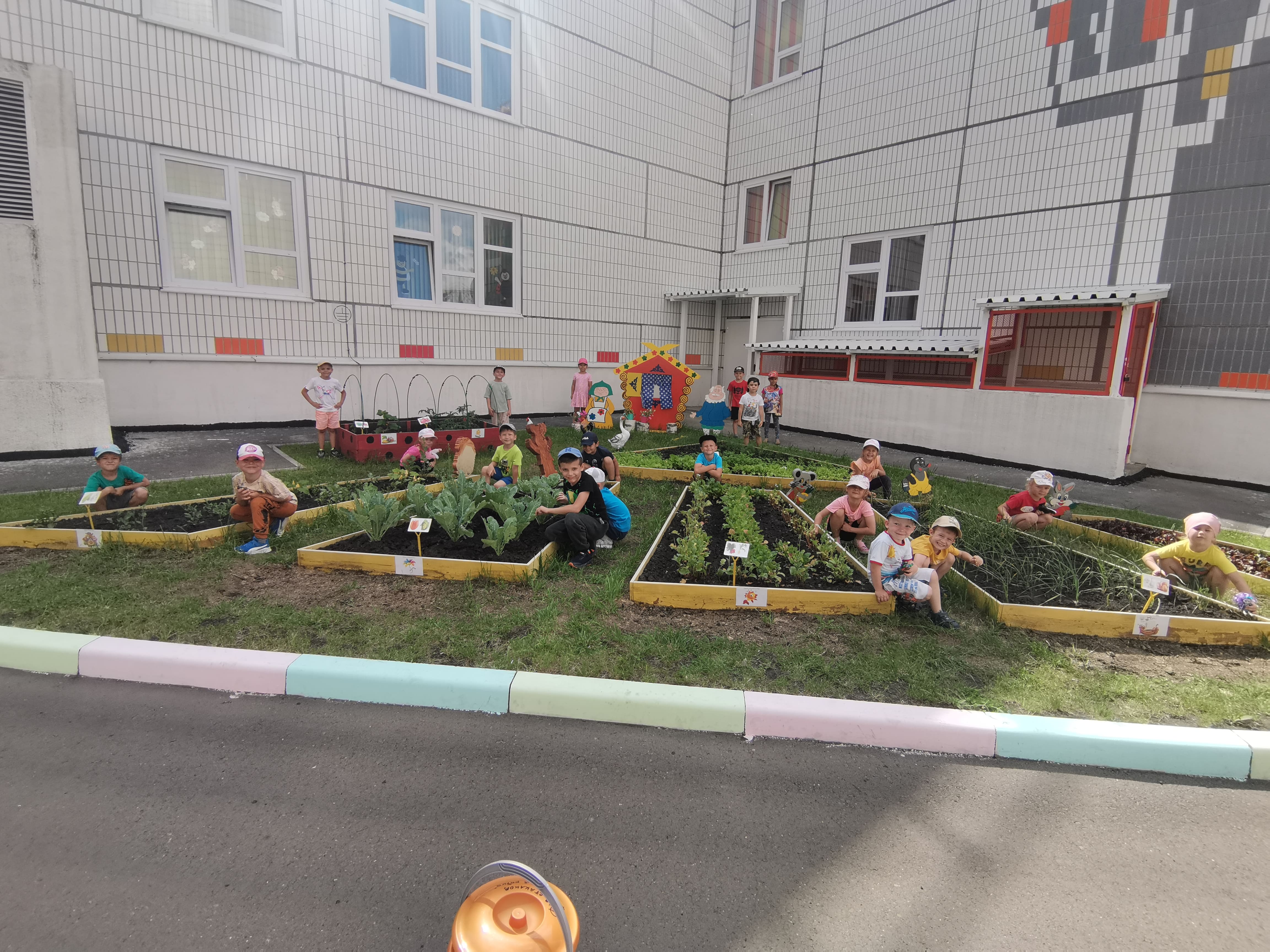 Также еще более наполнили один из элементов нашего проекта «Сказочный огород», в котором представлены не только грядки, но и сказочные персонажи, такие как бабушка, с дедушкой, домашние животные, сказочные животные любители определённых овощей, красивые цветы, деревенская избушка для обыгрывания сюжетно-ролевых игр.